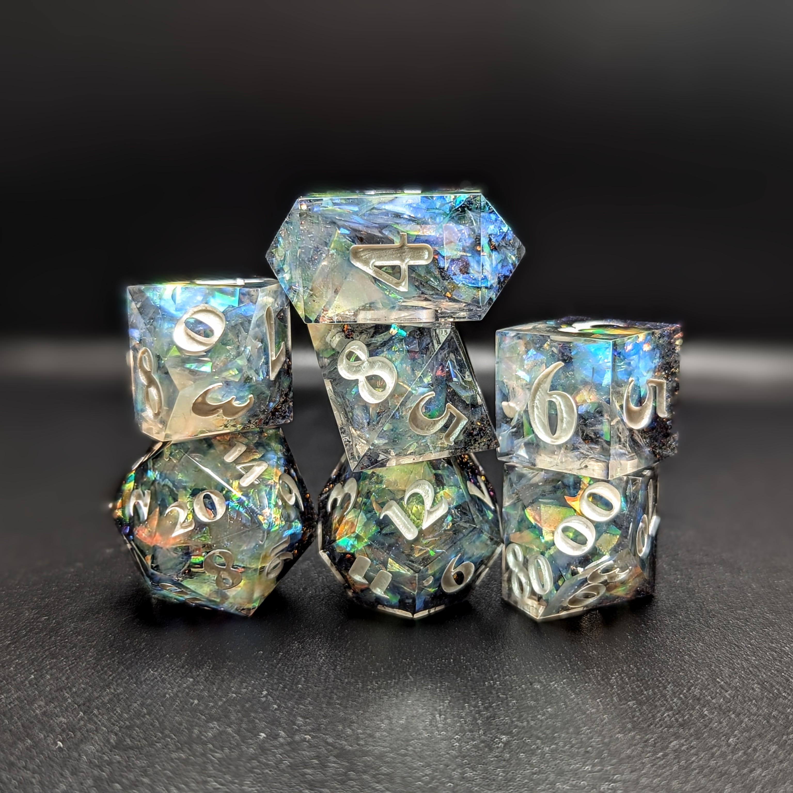 Mylar flakes and a beautiful pearlescent shimmer create an ethereal glow in this handmade resin sharp edge dice set. The numbers are painted pearl white.